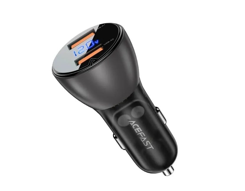 Power your journeys with our intelligent car charger. It features two high-output ports and a clear digital display that shows the charging status and voltage, ensuring your devices are charged safely and efficiently while you drive.